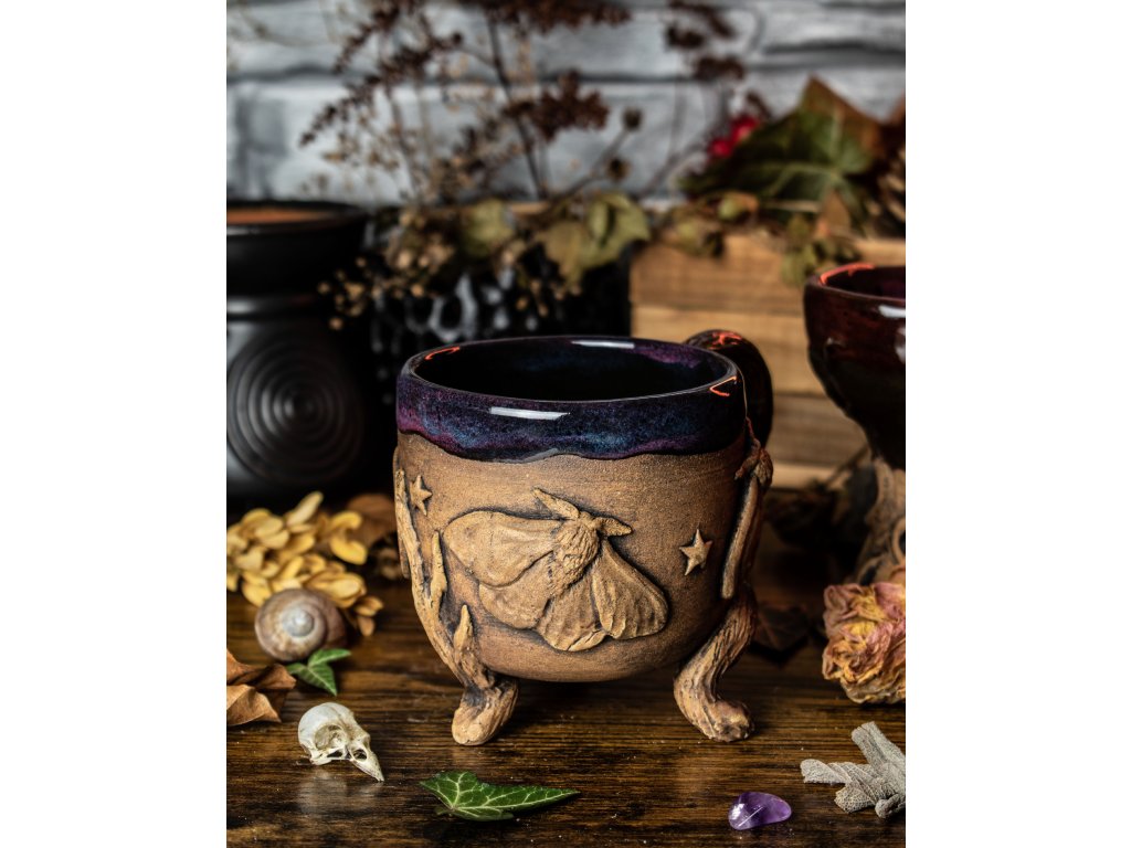 Kameninový hrneček s kapkou magie jsem vytočila na hrnčířském kruhu, vyzdobila kouzelnými přírodními motivy, vypálila, naglazovala a podruhé vypálila na vysokou teplotu.