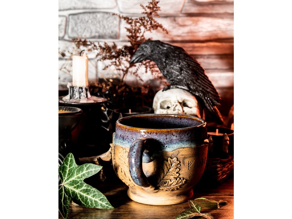 Kameninový hrneček s kapkou magie jsem vytočila na hrnčířském kruhu, vyzdobila kouzelnými přírodními motivy, vypálila, naglazovala a podruhé vypálila na vysokou teplotu.