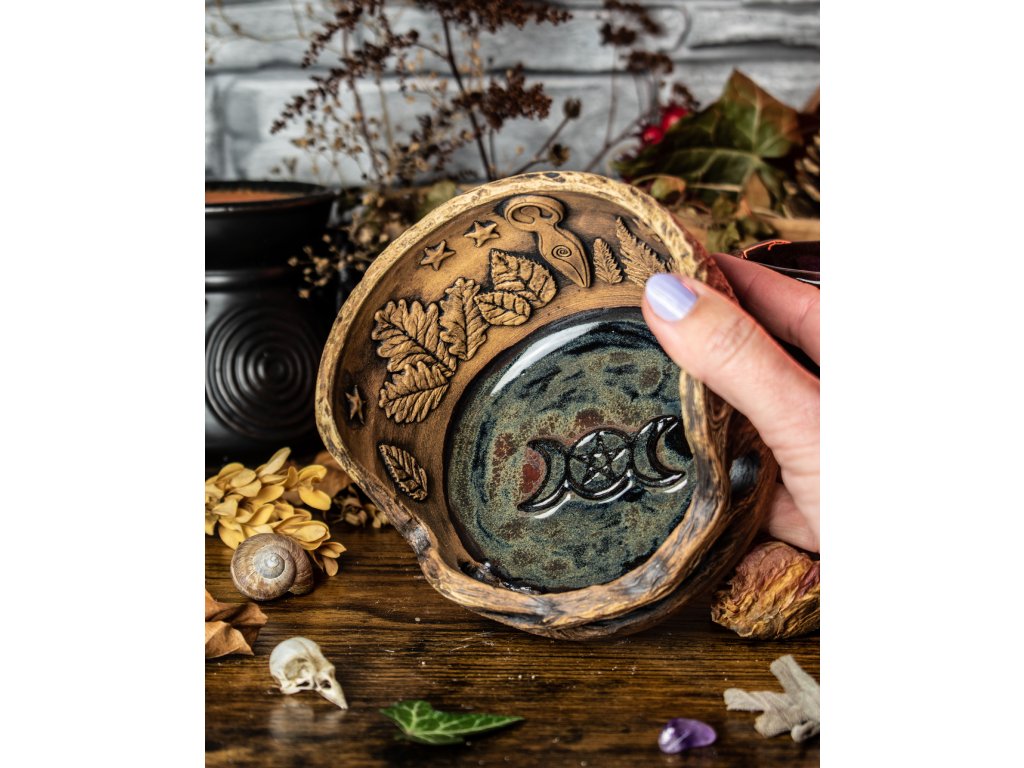 Ručně modelovaný keramický oltář vznikl v mé dílně na okraji lesa, kde se setkává starobylé řemeslo s magií přírody. Každý reliéf, každá větev a list nesou v sobě energii místa, kde se zrodily.