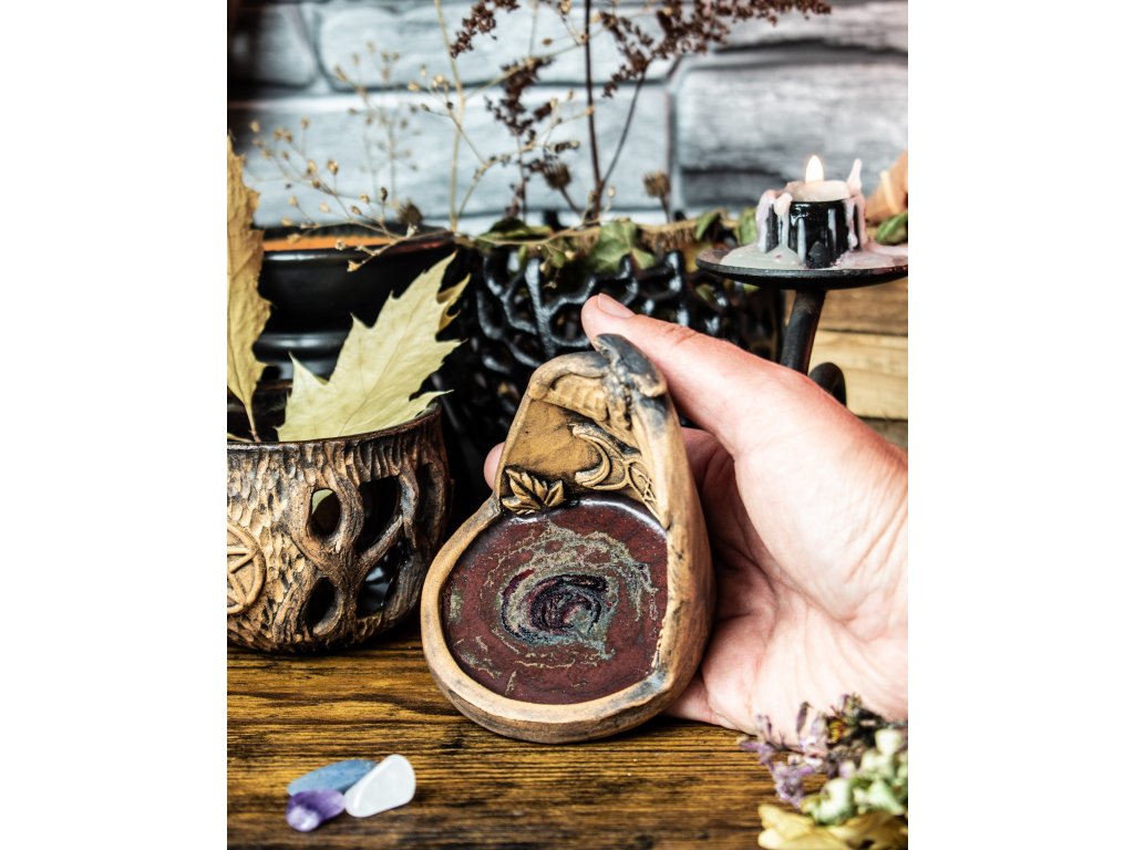 Ručně modelovaný keramický oltář vznikl v mé dílně na okraji lesa, kde se setkává starobylé řemeslo s magií přírody. Každý reliéf, každá větev a list nesou v sobě energii místa, kde se zrodily.
