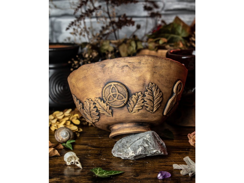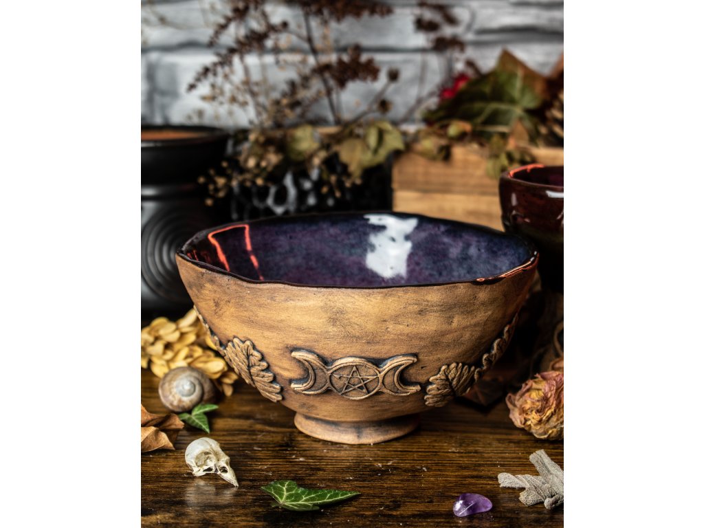 Kameninovou misku s kapkou magie jsem ručně vymodelovala, vyzdobila kouzelnými přírodními motivy, vypálila, naglazovala a podruhé vypálila na vysokou teplotu.