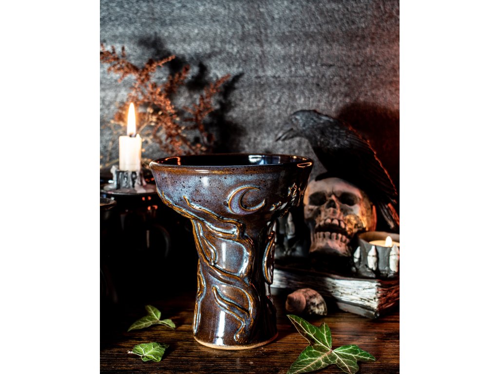 Kameninový pohár s kapkou magie jsem vytočila na hrnčířském kruhu, vyzdobila kouzelnými přírodními motivy, vypálila, naglazovala a podruhé vypálila na vysokou teplotu.
